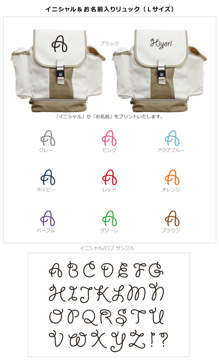 「お名前」か「イニシャルのアルファベット」をふた部分にプリントして作るオーダーメイドリュックサックです。
