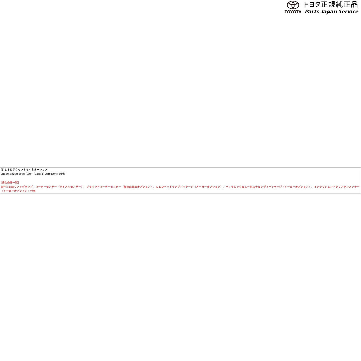 製品品番・08539-52250対応車種(対応年式含む)車名:10系アクア年式:201908〜カタログ日付:2019.08材質/特徴[1]LEDアクセントイルミネーション08539-52250 適合: (02)〜(04)(11) 適合条件※1参照[適合条件一覧]条件※1:除くフォグランプ.コーナーセンサー(ボイス4センサー).ブラインドコーナーモニター(販売店装着オプション).LEDヘッドランプパッケージ(メーカーオプション).パノラミックビュー対応ナビレディパッケージ(メーカーオプション).インテリジェントクリアランスソナー(メーカーオプション)付車商品説明[設定]詳しくはメーカーHPをご確認ください注意事項*写真の色や照度は実際とは異なります。